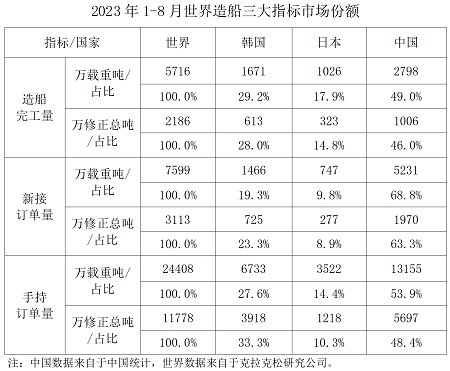 1~8月,我國(guó)造船完工量、新接訂單量、手持訂單量分別占世界市場(chǎng)份額的49%、68.8%和53.9%。